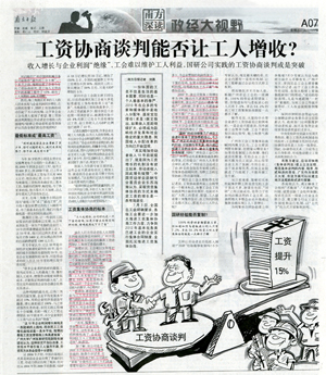 7月14日,《南方日报》以《工资协商谈判能否让工人增收?——国研公司实践的工资协商谈判或是突破》为题,用三分之二大版篇幅报道广州市LD.COM乐动体育(中国)科技公司设备制造有限公司实践工资集体协商的成功经验。
