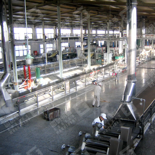 熟鲜面生产线集连续和面、带式熟化、八滚轧片压延、切条切断为一体。压延辊、面刀、切刀、输送等装置,采用单机变频调速控制,面片厚度、面条长短可任意调节,可实现自动分份计量等功能。该生产线运行平稳、操作简便,是冷冻面、乌冬面、日式拉面等面制品的理想设备。
