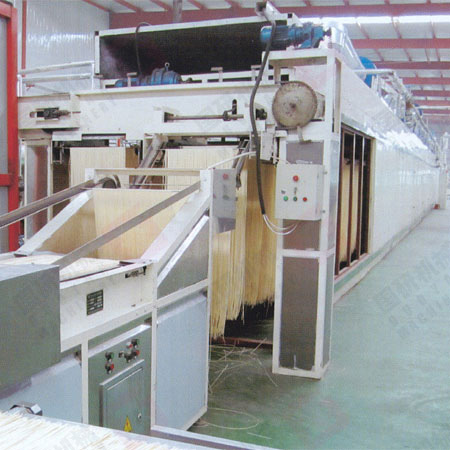 新型低温挂面生产线由烘干运行主传动、悬挂链条、吊挂装置、钢结构散热吊风扇、排潮风机、空气能加热器、传感器、温湿度检测控制仪、电器控制柜等组成。